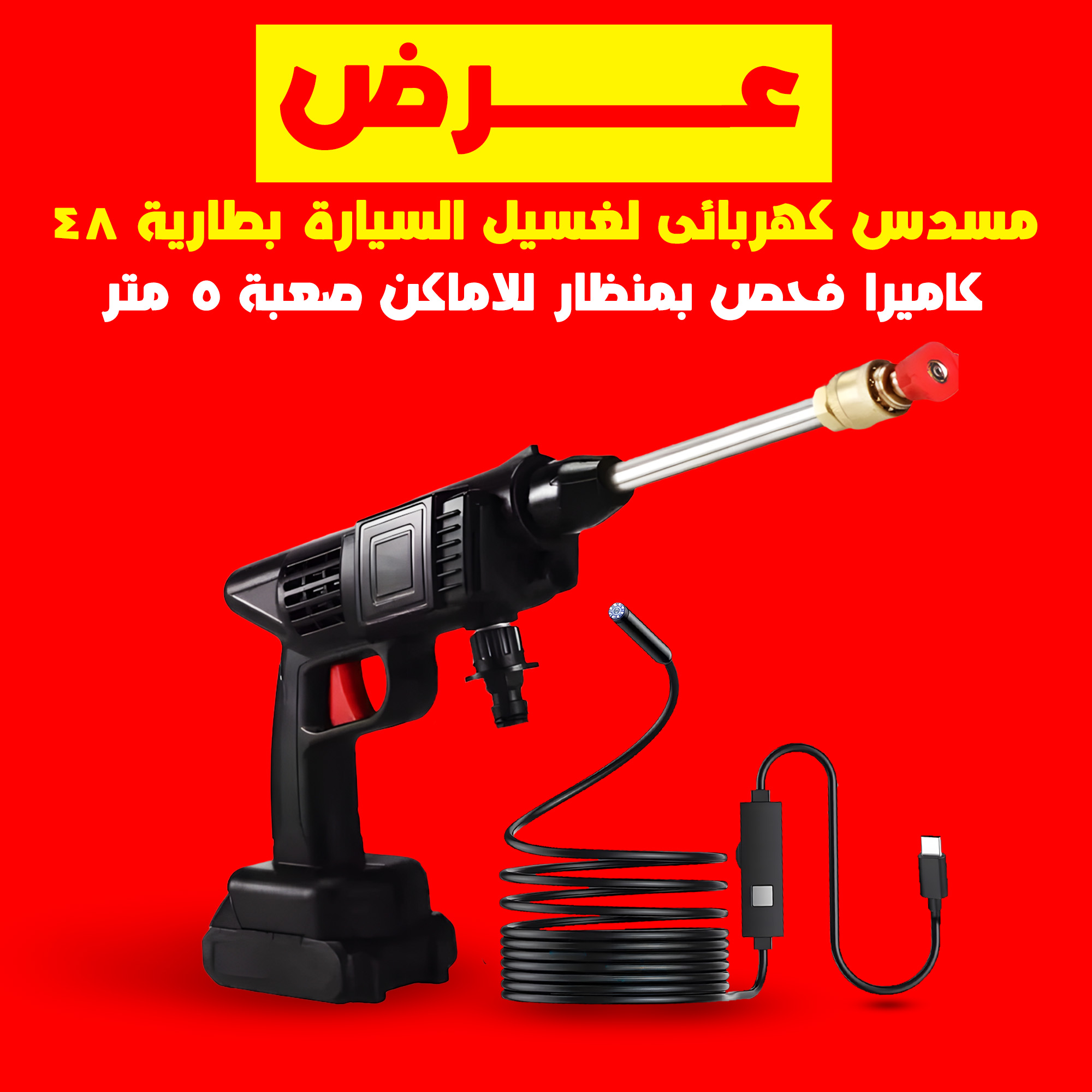 عرض مسدس كهربائى لغسيل السيارة بطارية 48 + كاميرا فحص بمنظار للاماكن صعبة 5 متر