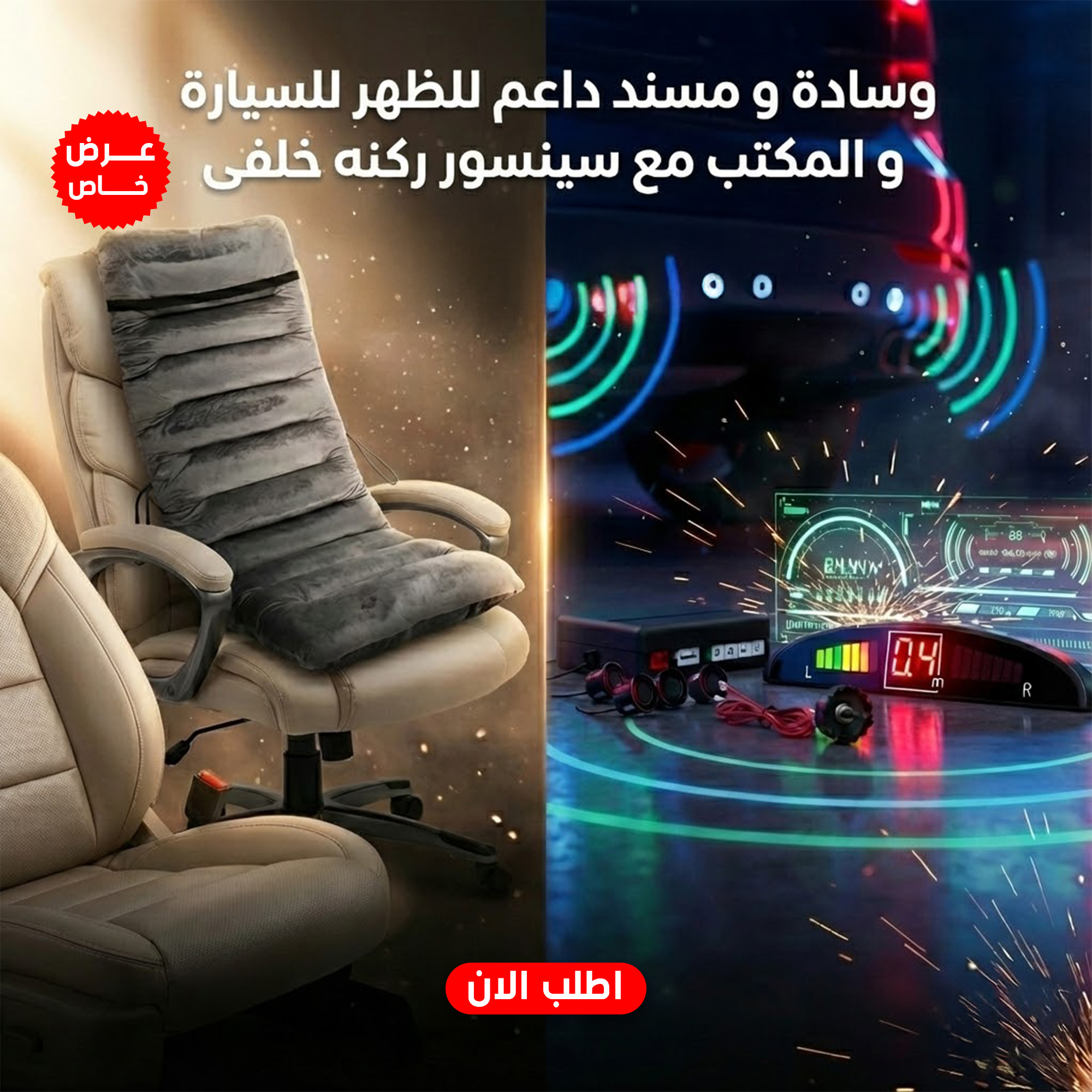 عرض شامل: وسادة ومسند ظهر مريح + سينسور ركن خلفي ذكي يخلي عربيتك ومكتبك مريح وآمن طول اليوم!