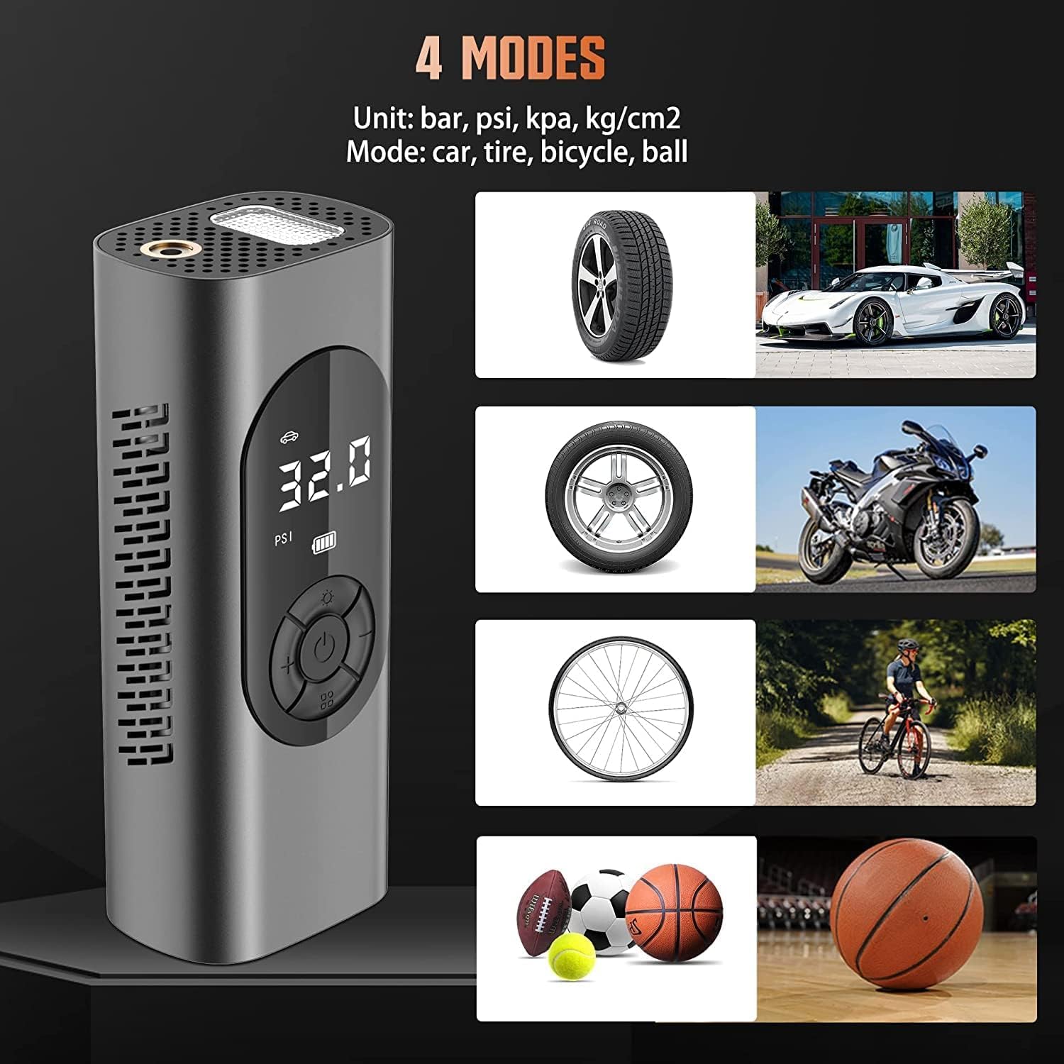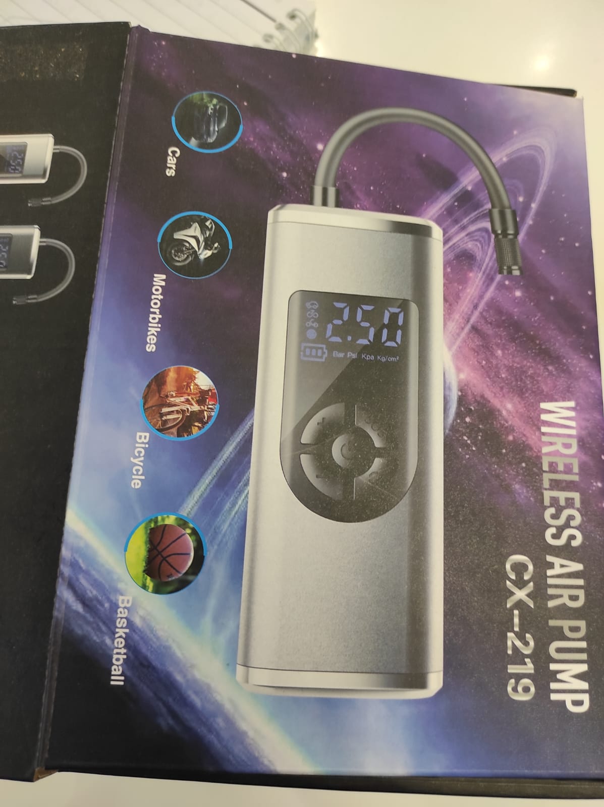 – ينفخ إطارات السيارات، الموتوسيكلات، الدراجات والكرات بسهولة وسرعة.